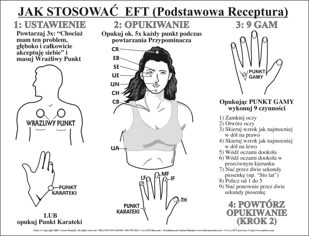 Metoda ta inaczej nazywana jest również tapping, czyli opukiwanie, bo właśnie dokładnie na tym polega, choć do pełnej skuteczności musi być również wspomagana pozytywnymi afirmacjami. Podczas stukania konkretnego punktu należy zatem skupić się na dręczonej nas emocji, czy problemie i powtarzać np. Mimo, że mam problemy z jedzeniem, akceptuję siebie całkowicie i głęboko. Wspomaganie czynności ruchowej poprzez wypowiadanie na głos określonego problemu, może dać niesamowite efekty. Nasze ciało jest kontrolowane głównie przez prawą półkulę mózgu, a ośrodki logicznego myślenia, rozumienia, wnioskowania, języka znajdują się w półkuli lewej. Aby naprawdę dotrzeć do sedna problemu na poziomie ciała należy zatem zmienić formę komunikatu, bo sama mowa jest niezrozumiała.